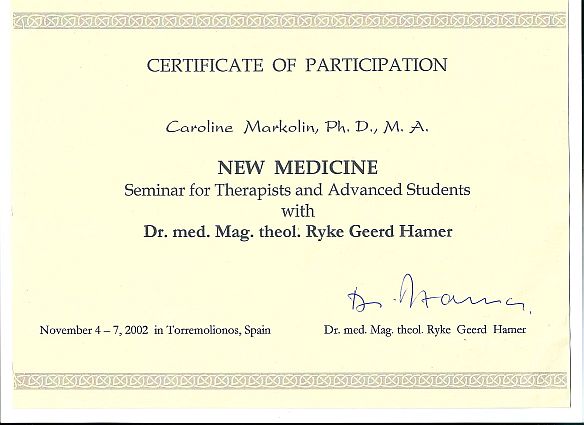Caroline Markolin is devoted to make Dr. Hamer’s discoveries available to the English-speaking world through her teachings and her presentation of German New Medicine (GNM) on this website.